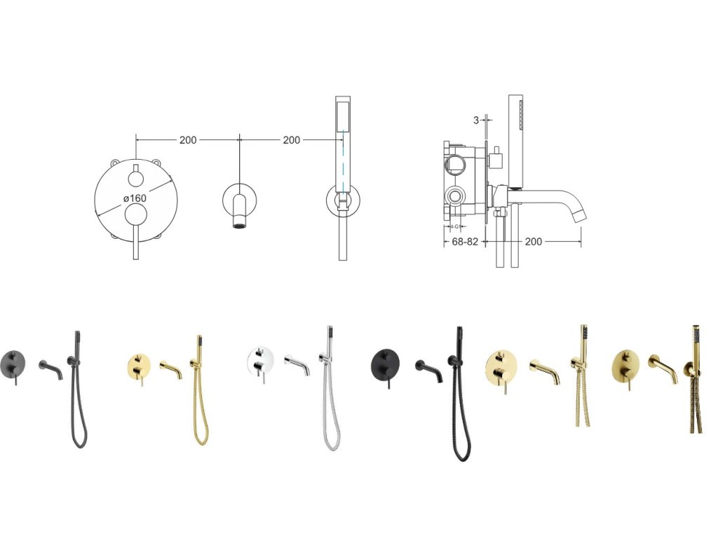 - Set obsahuje podomítkovou baterii, vývod ze stěny s držákem, ruční sprchu a hadici