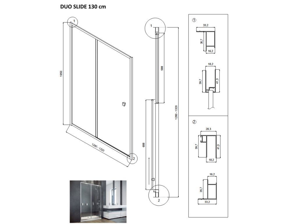 - Montážní rozměr pro šířku 130 cm: 128 - 132 × 195 cm, šířka vstupu: 51,5 cm