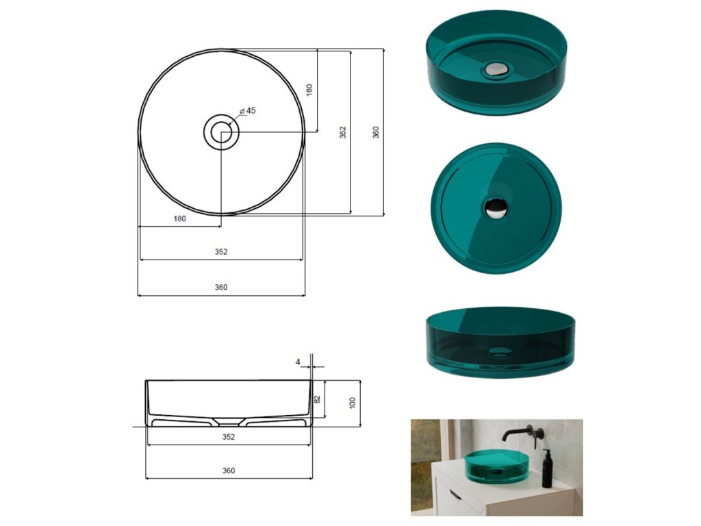 Umyvadlo na desku ENYA, které jsou vyrobené ze syntetické pryskyřice se vyznačují průhledností materiálu a dokonale hladkým povrchem. Směs pryskyřice s vybranými pigmenty probarvující hmotu (zelená, modrá, černá a hnědá barva), ze které jsou výrobky odlévány, umožňuje vytvářet modely s velmi tenkými hranami, které si v koupelně zachovávají svou funkčnost. Výhodou je velmi snadná instalace. Součástí umyvadla je také click/clack systém bez přepadu.