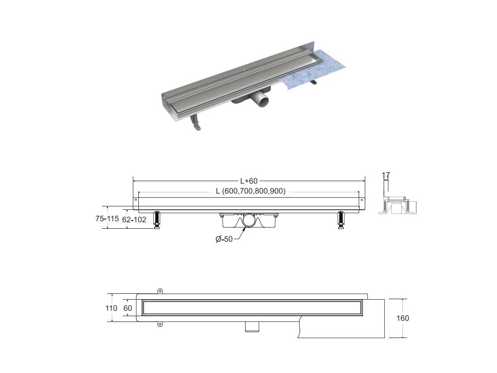 - sada obsahuje: žlab se sifonem a nožičkami, montážní patky, rošt a těsnící rohož