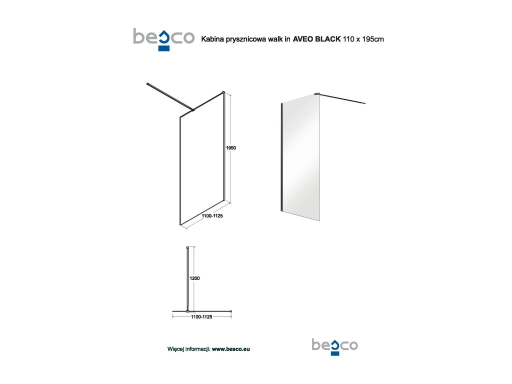 BESCO Walk-in sprchový kout AVEO BLACK Barva rámu - Černá, Pevná stěna - Bez pevné stěny, Rozměr A - 110, Rozměr C - 195, Výplň - Čiré bezpečnostní sklo - 8 mm BCAVEO110BL