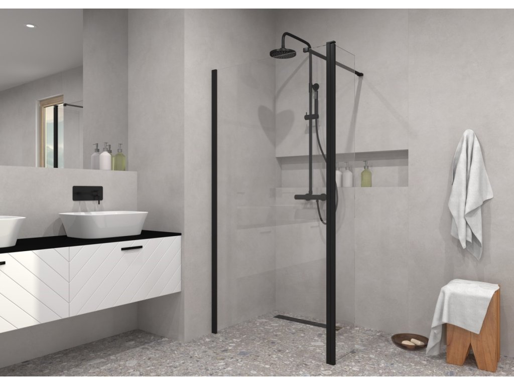 Exkluzivní Walk-in sprchová zástěna ECO-N BLACK, dodáváme ve čtyřech rozměrech. Sprchovou zástěnu tvoří pouze čelní stěna, která je zajištěna rozpěrnou tyčí s maximální délkou roztažení až 120 cm. Čelní stěnu lze doplnit jednou boční stěnou. Snadno tak vytvoříte sprchový kout přesně pro Váš prostor. Díky této konstrukci snadno vytvoříte bezbariérový sprchový kout. Možná instalace i na vaničku (pouze v případě bez montáže dodatečného bočního panelu) nebo přímo na podlahu (v případě s montáží dodatečného bočního panelu).