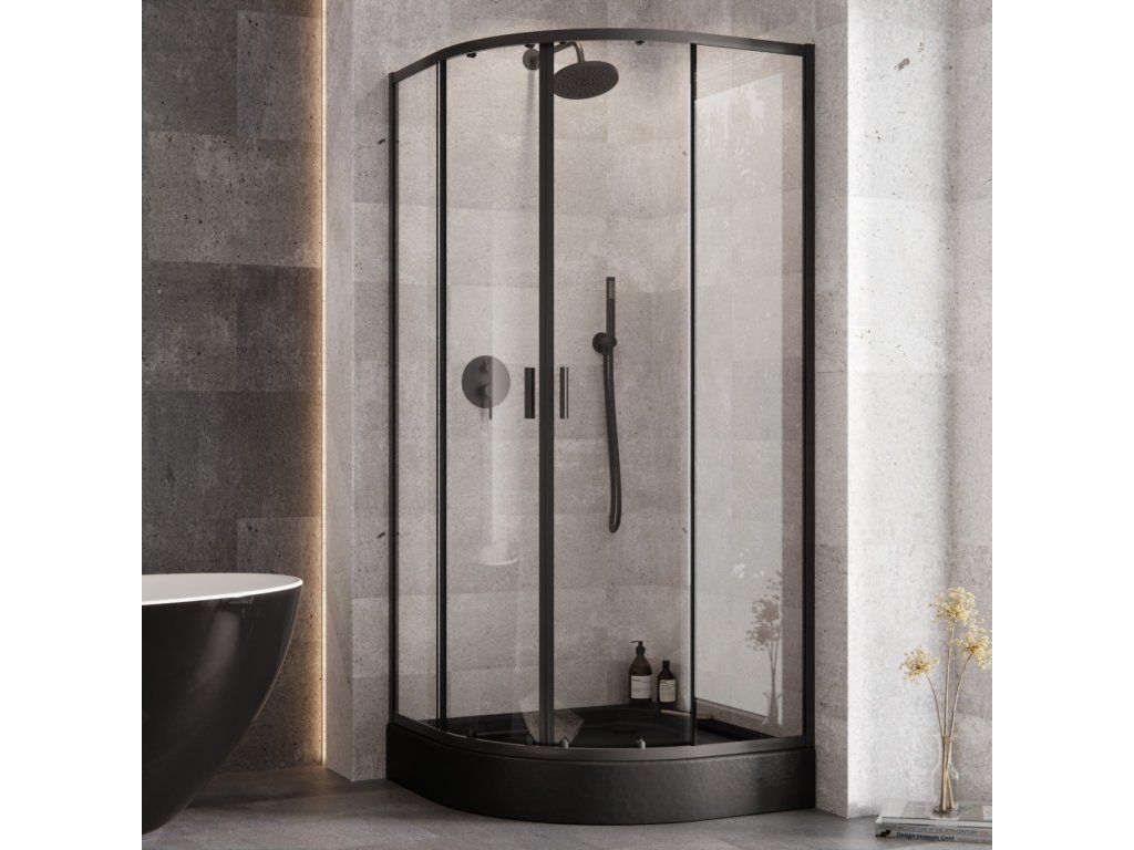 - designový čtvrtkruhový sprchový kout s černými profily včetně sprchové vaničky a sprchového sifonu