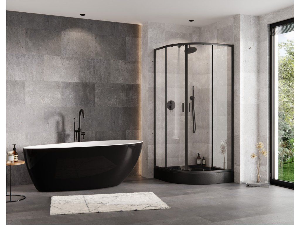 - designový čtvrtkruhový sprchový kout s černými profily včetně sprchové vaničky a sprchového sifonu