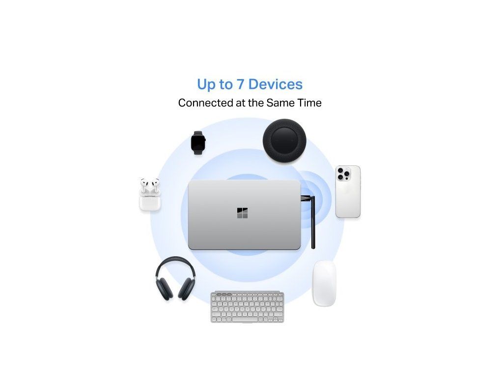 Díky nízkoenergetické technologii je adaptér vhodný pro nepřetržitý provoz. Zvládne připojit až 7 zařízení současně, takže snadno připojíte sluchátka, myš, klávesnici, reproduktory a další periferie.