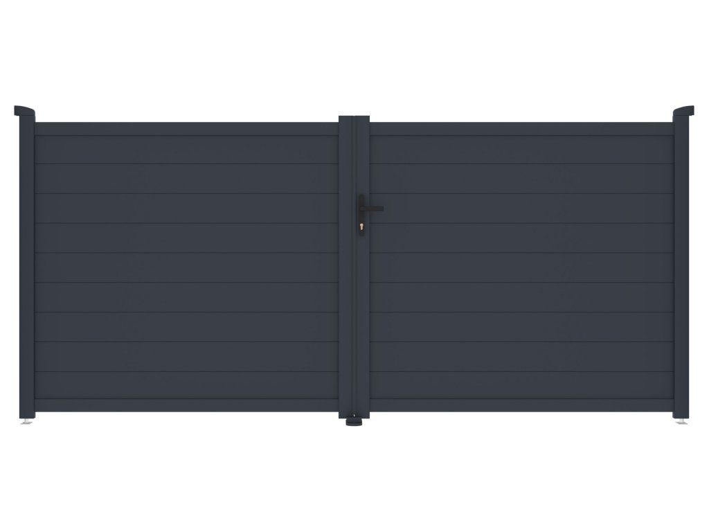Výplň s horizontálně uloženými lamelami v atraktivním grafitovém provedení kombinuje dostatek soukromí s moderním designem, takže brána s otevíráním dovnitř bude slušet každému typu oplocené stavby.