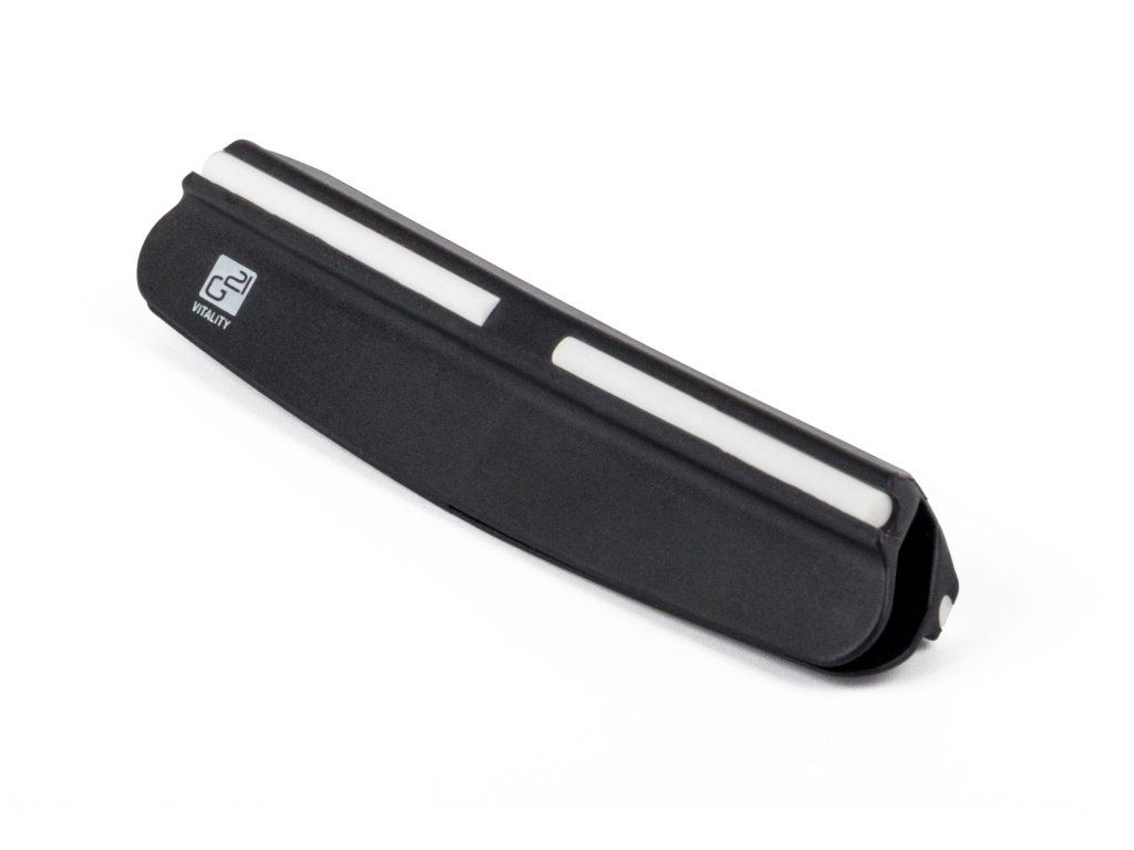 Brusný kámen z korundu je uložen v silikonovém bloku s výřezem na míru. V balení naleznete i šikovné vodítko s nastaveným úhlem broušení (15 °).