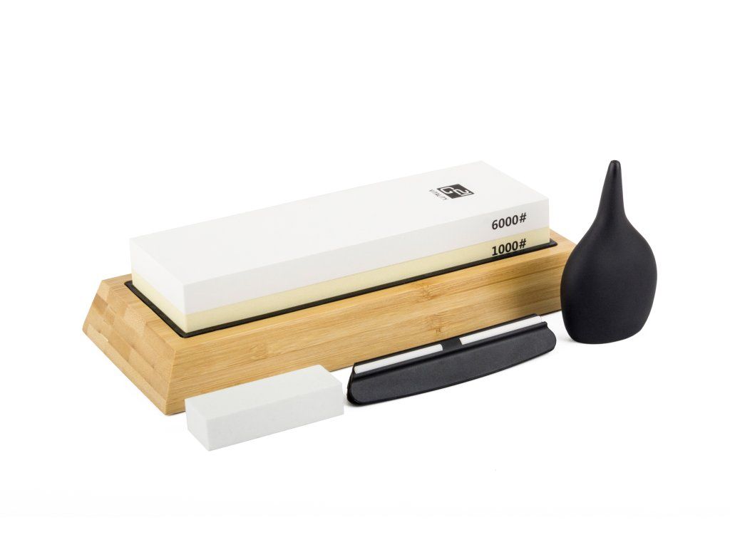 Brusný kámen z korundu je uložen v bambusovém bloku s výřezem na míru. V balení naleznete i keramické hladítko pro srovnání a zahlazení povrchu kamene po broušení, nechybí ani praktické a šikovné vodítko s nastaveným úhlem broušení (15 °) nebo balonek pro dávkování vody či oleje k broušení.