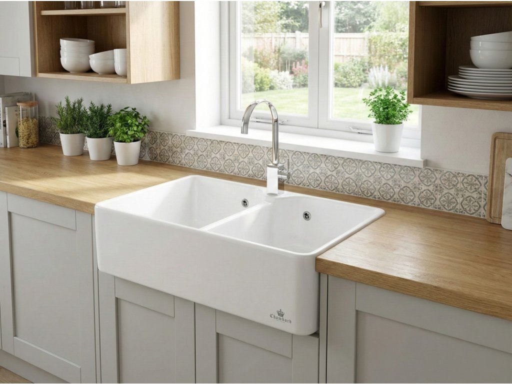 Chambord Farmhouse 800.2 je ideální koupí, pokud uvažujete o dvojdřezu z keramiky v modulovém provedení, s osazením na skříňku. Jeho výhodou je možnost situovat kuchyňskou baterii do dřezu. Tento fakt oceníte hlavně v případě, jak jste vlastníkem dřevěné, nebo laminátové pracovní desky, a instalace baterie do desky by Vám mohla v budoucnosti způsobit nepříjemnosti v podobě protečení a poškození materiálu desky.
