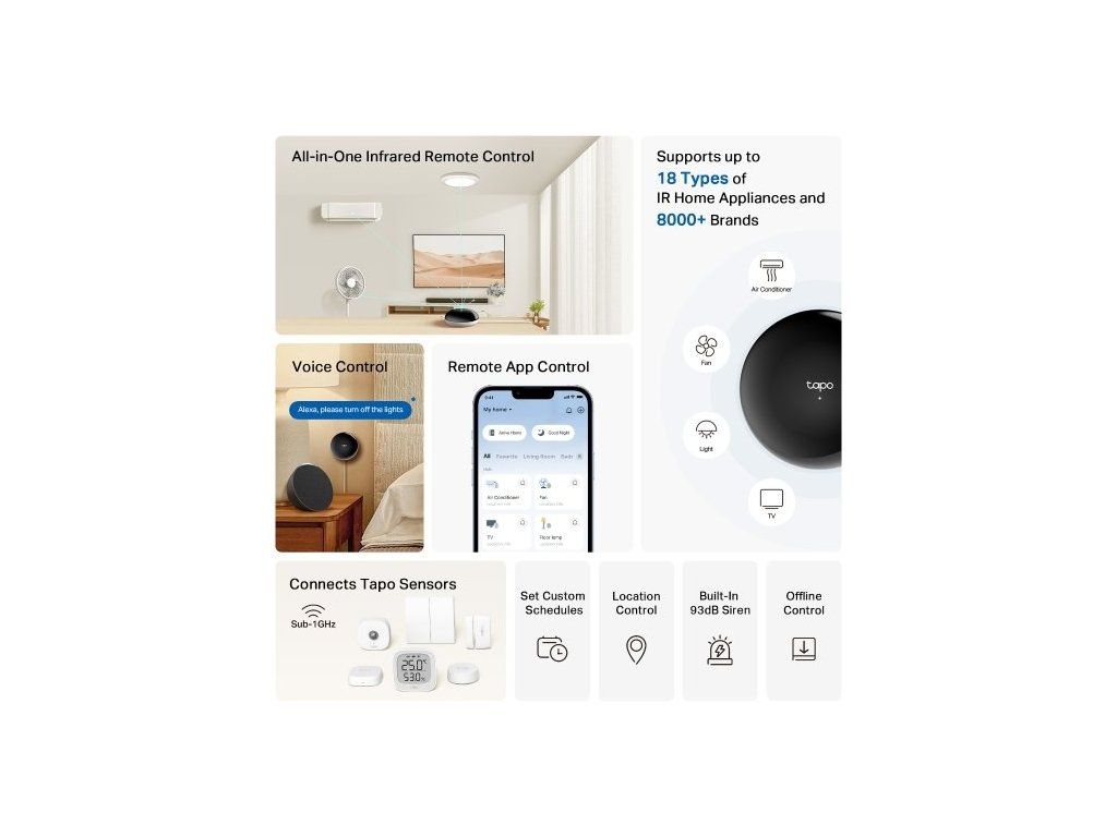 IoT hub TP-Link Tapo H110 vám zjednoduší správu vaší chytré domácnosti. Je kompatibilní s širokou škálou zařízení, které s ním propojíte. Podporuje 18 typů zařízení a více než 8 000 značek. Kromě toho dochází každé 3 měsíce k postupné aktualizaci databáze a kompatibilita hubu se tím rozšiřuje o nové modely. Spolupracuje s chytrými zařízeními Tapo (například kamery a senzory).