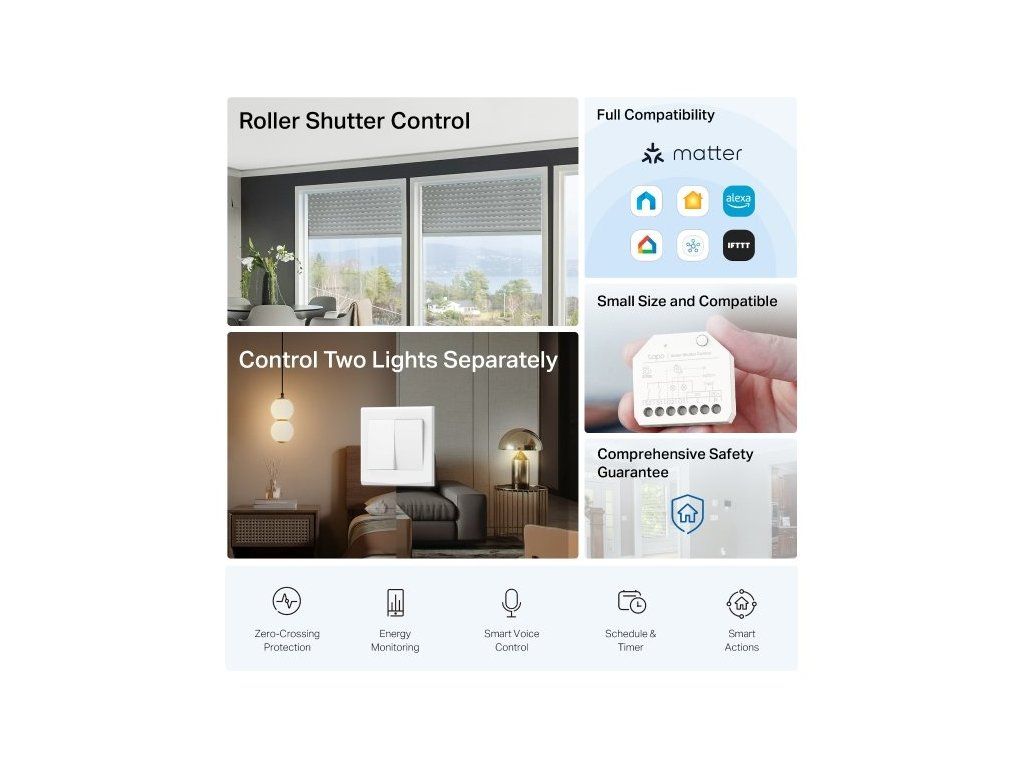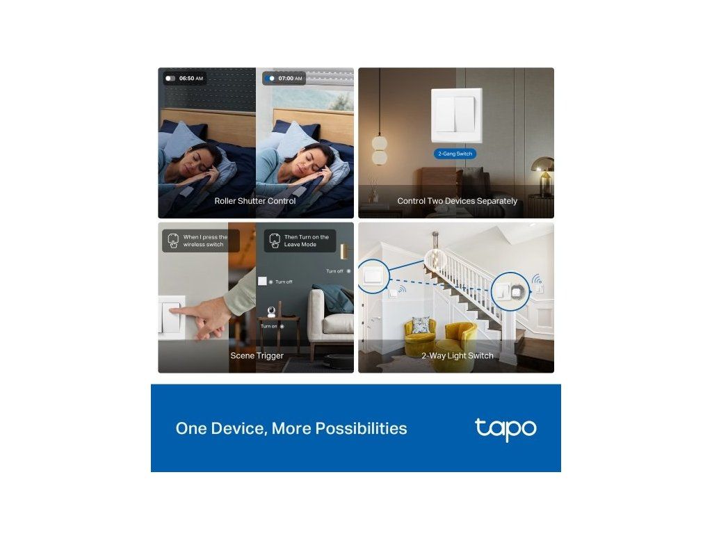 Chytrý spínací modul TP-Link Tapo S112 vám umožní nastavit běžná světla, zásuvky nebo rolety na dálku, automaticky nebo pomocí hlasu. Díky dvěma samostatným relé výstupům ovládá dvě různá zařízení současně, například stropní světlo a žaluzie. Díky kompaktním rozměrům ho snadno umístíte i do těsné instalační krabičky, za stávající vypínač nebo zásuvku.