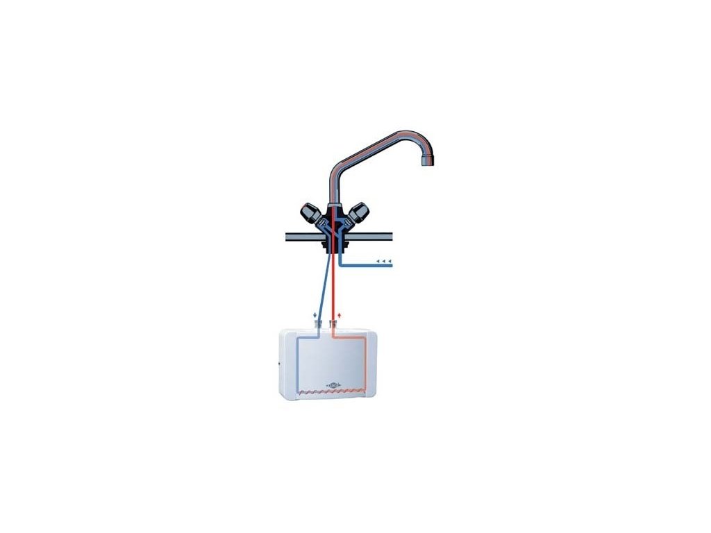 - Malý průtokový ohřívač vody pro beztlakovou instalaci, ideální pro umyvadlo. Ohřívač je umístěn pod umyvadlem nebo dřezem (spodní montáž).