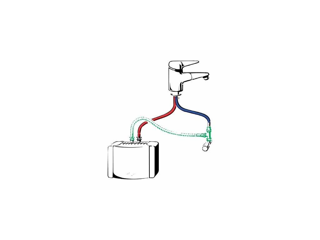 - Malý průtokový ohřívač vody pro tlakovou instalaci, ideální pro umyvadlo. Ohřívač je umístěn pod umyvadlem nebo dřezem.