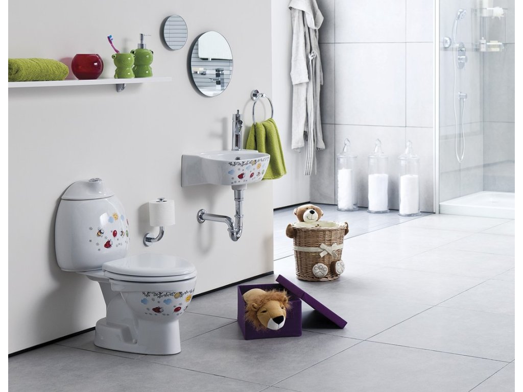 Série dětské keramiky KID je vhodná nejen pro jesle či mateřské školky, ale nalezne své místo i ve standardní koupelně a všude tam, kde je běžná keramika pro děti příliš velká. Lze volit bílou keramiku nebo veselý barevný potisk, který jistě vykouzlí úsměv na tvářích všech malých uživatelů.