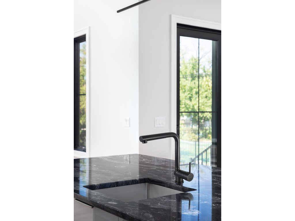 Baterie Boca s výsuvnou sprškou se vyznačuje moderním designem a funkčností. Vysoké tělo a výsuvná sprška usnadňují kuchyňskou práci kolem dřezu. Mytí ovoce, zeleniny a plnění vysokých nádob vodou je nyní extrémně snadné. Baterie má boční páku, kterou lze ovládat jedním prstem nebo zápěstím, pokud máte špinavé ruce. Černý, elegantní, matný povrch je odolný a perfektně se hodí do moderních nebo průmyslových aranžmá.