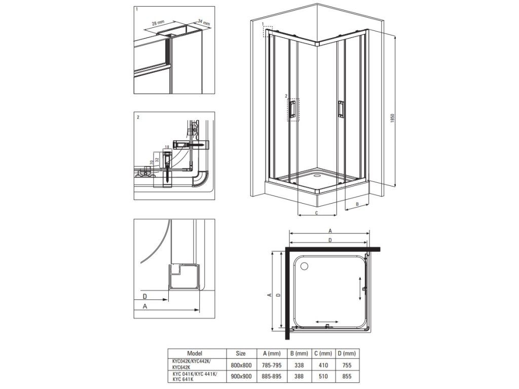 Tabulka rozměrů sprchového koutu Funkia