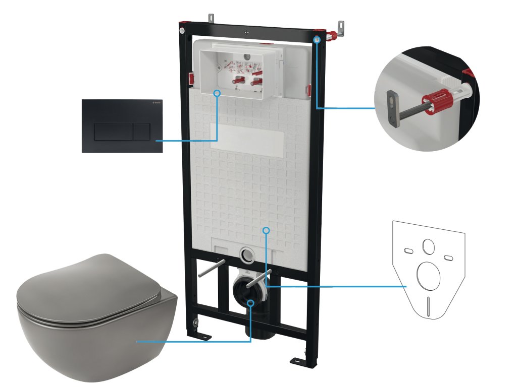 - součástí je splachovací modul, závěsná mísa s WC sedátkem, splachovací tlačítko, šrouby k připevnění mísy
