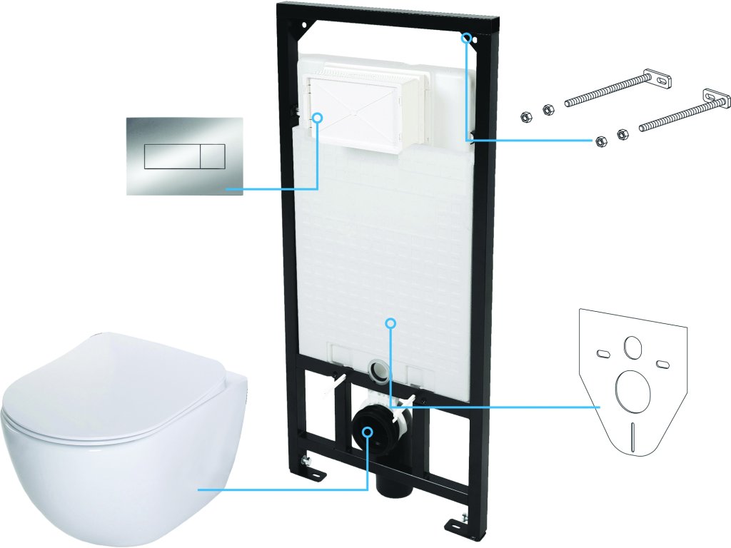- součástí je splachovací modul, závěsná mísa s WC sedátkem, splachovací tlačítko, šrouby k připevnění mísy