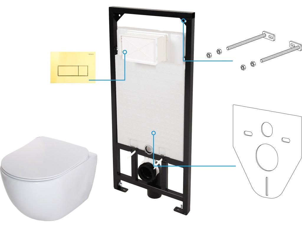 WC komplet se skládá z WC mísy Peonia se záchodovým sedátkem, zápustného rámu pro závěsné mísy a zlatého splachovacího tlačítka. Bezokrajová mísa Peonia má zaoblené tvary, je bez hran (rimless), což usnadňuje její udržování v čistotě. Rám má možnost tichého, dvojitého splachování - malé (3l) a velké (6l). Tlačítko ve zlatém provedení dodá koupelně nádech extravagance a díky plochému designu dokonale přilne ke stěně.