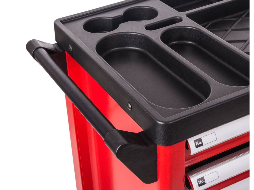 Díky promyšlenému řešení horní strany můžete mít na pracovní desce odložené věci, aniž by spadly při pohybu vozíku. V pracovní desce jsou zapuštěné přihrádky, ve kterých můžete mít uloženy nejčastěji používané nářadí, šrouby a díly, které potřebujete mít stále při ruce a podobně.