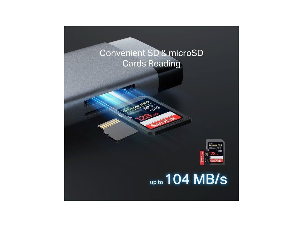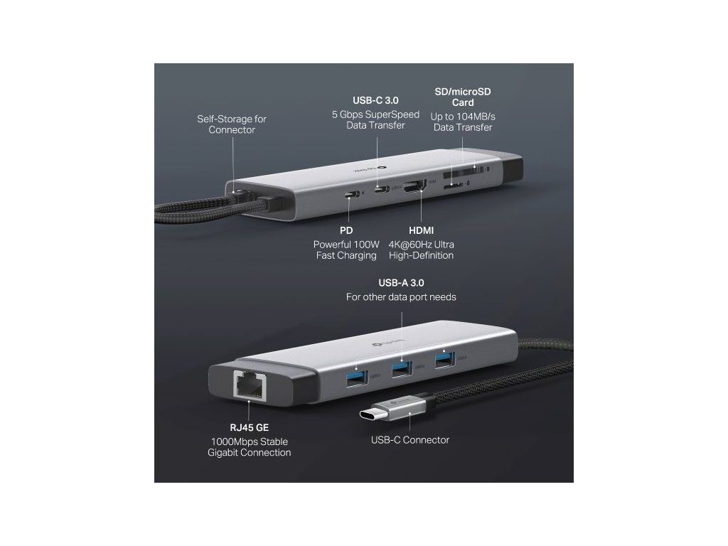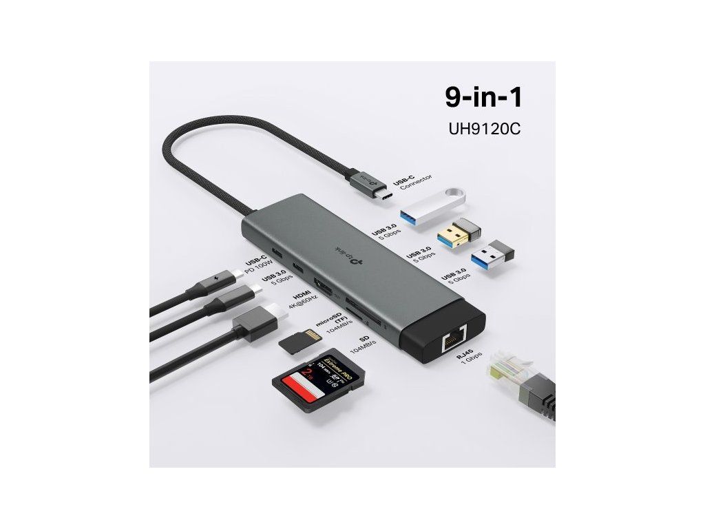 Rozšiřte možnosti svého zařízení s dokovací stanicí TP-Link UH9120C. Na jednom kompaktním zařízení se nachází celkem 9 portů. Najdete na něm port HDMI s podporou rozlišení 4K při 60 Hz, port s podporou gigabitového Ethernetu, slot na SD/microSD kartu, podporu 100W napájení a superrychlé USB porty (až 5 Gb/s). Díky snadné Plug & Play instalaci je stanice ideální pro každodenní práci i zábavu.