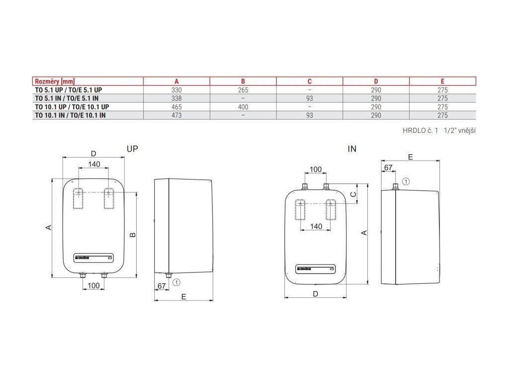 Elektrické topné těleso je součástí ohřívačeMožnost umístit pod (IN) nebo nad (UP) odběrné místo