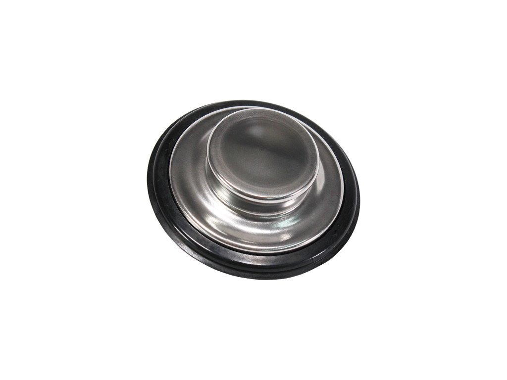 Robustní zátka s gumovým obvodovým těsněním, matným broušeným povrchem a lesklým úchytem, pro ucpání a napuštění dřezu s instalovaným drtičem.
