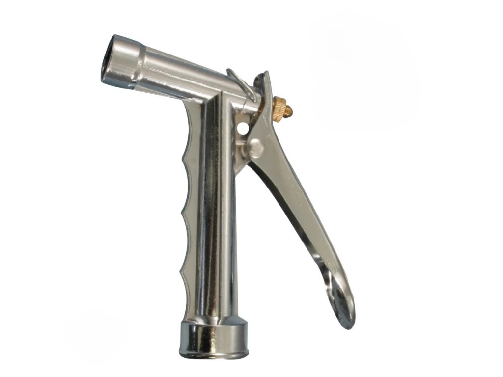 Zahradní postřikovací pistole s nastavitelnou kontrolou průtoku vody.Vyrobeno z kovu.
