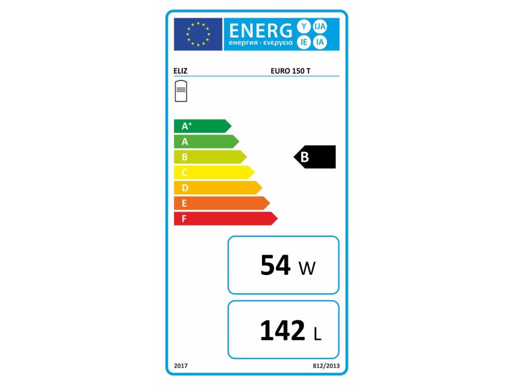 Kombinovaný ohřívač vody Elíz Euro 150 T svislý s objemem 150 litrů. Elektrická spirála a topný had s možností napojit na kotel UK. Smaltovaná nádrž je chráněna dvojitou anodovou ochranou, obsahuje otvor pro jímku komunikačního čidla pro kotel UK.