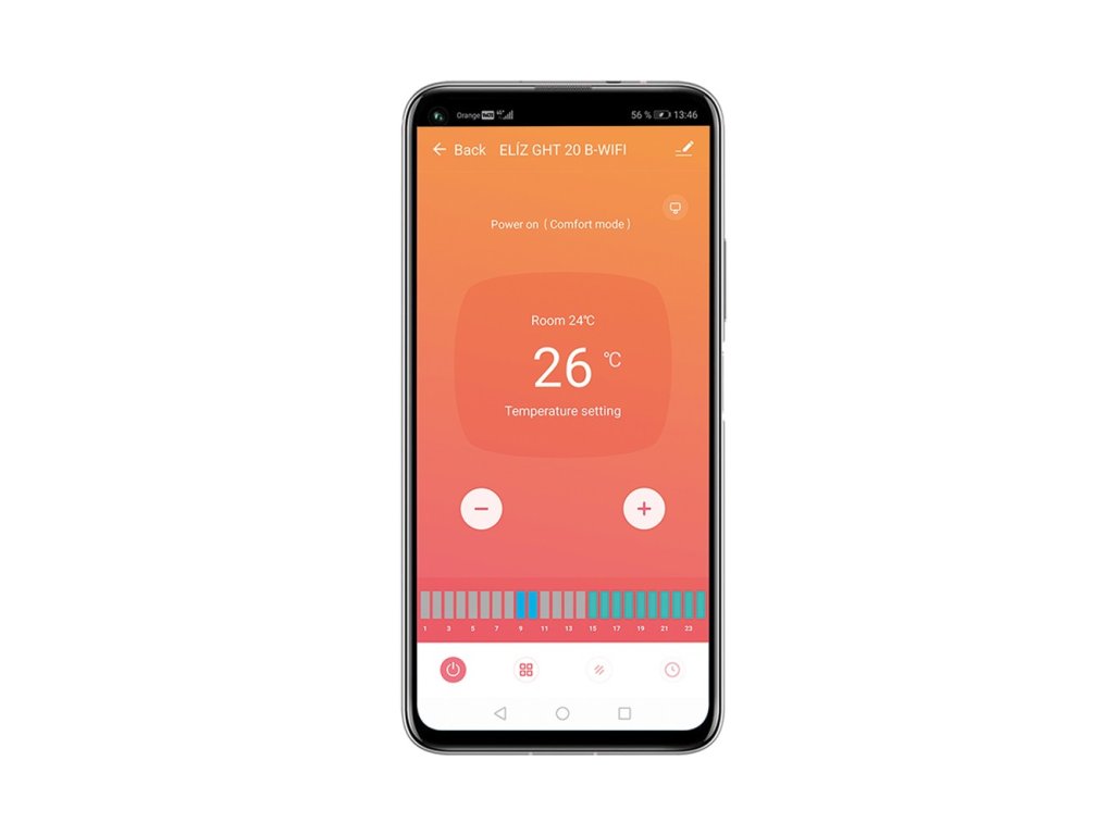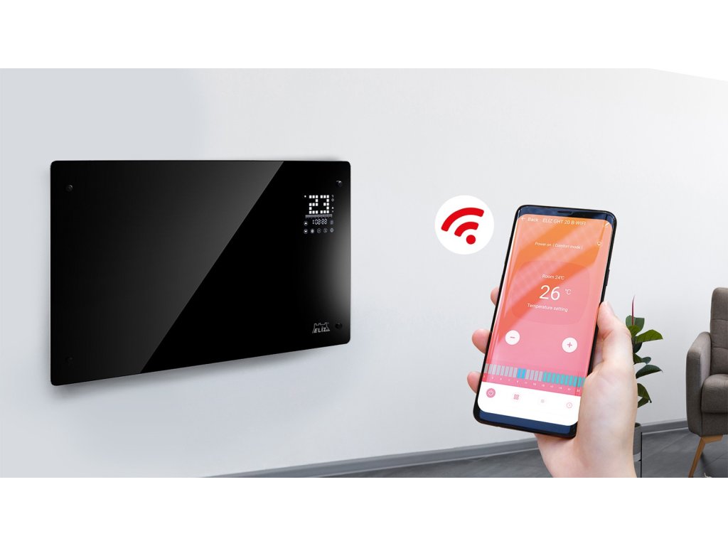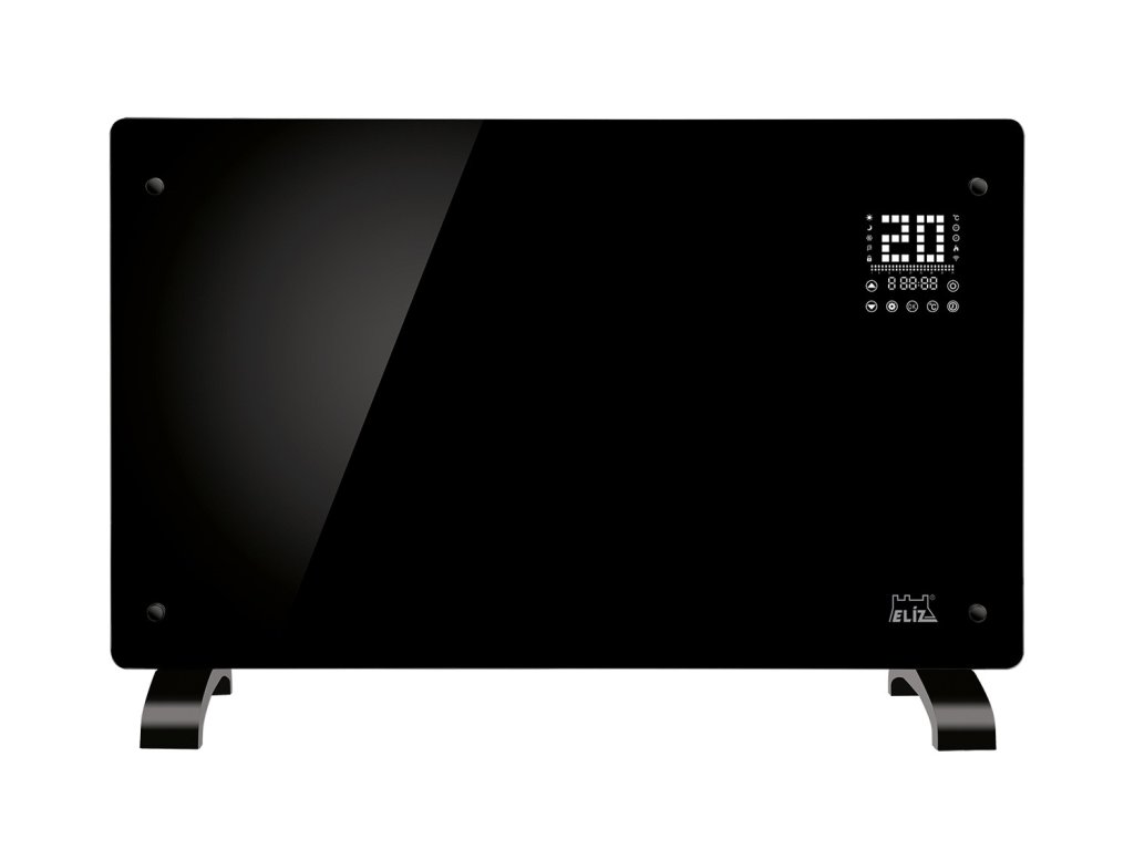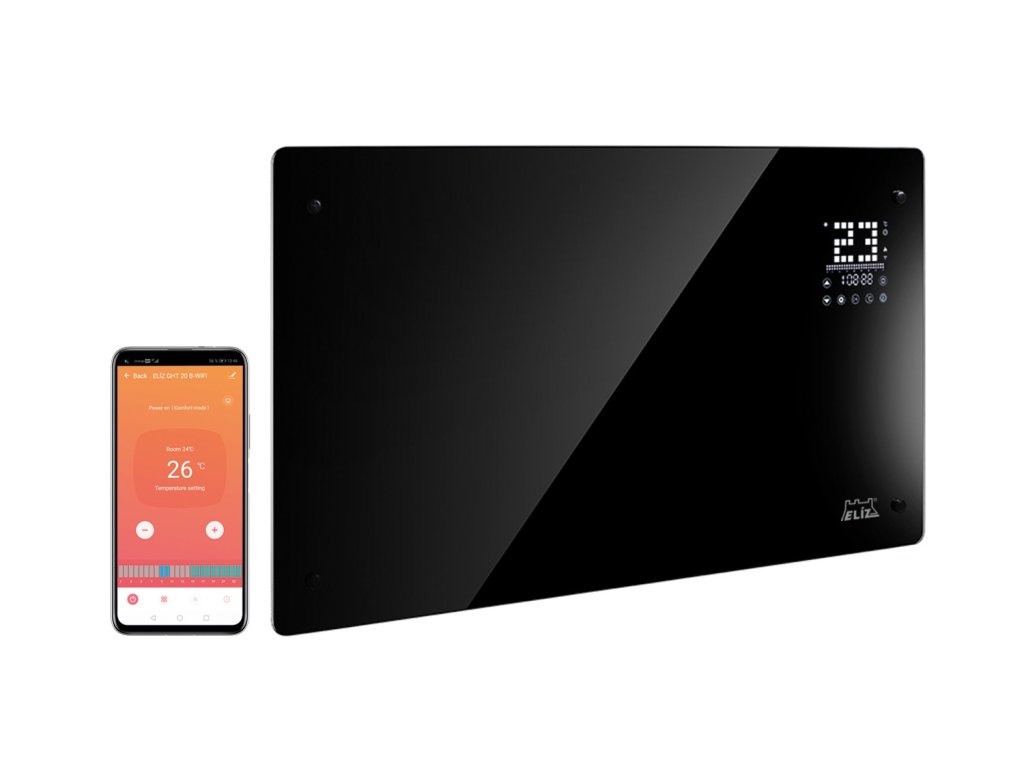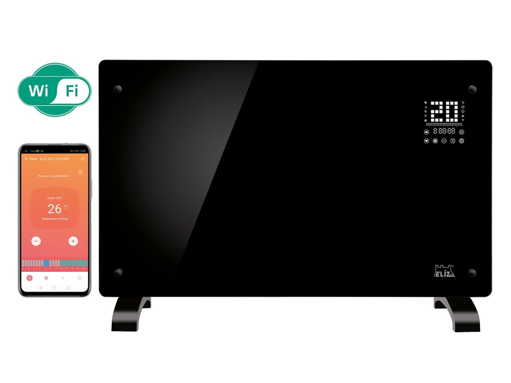 ELÍZ GHT 20 B-WIFI je moderní a energeticky účinný přímotopný elektrický konvektor s WIFI ovládáním. Zaujme svým elegantním designem v černé barvě a předním panelem z černého lesklého tvrzeného skla. Skleněný panel dodává konvektoru luxusní vzhled, a proto se hodí do každého interiéru. Konvektor je vybaven LED displejem s elektronickým dotykovým ovládáním a také je možné ovládat ho přes WIFI pomocí aplikace v telefonu či tabletu.