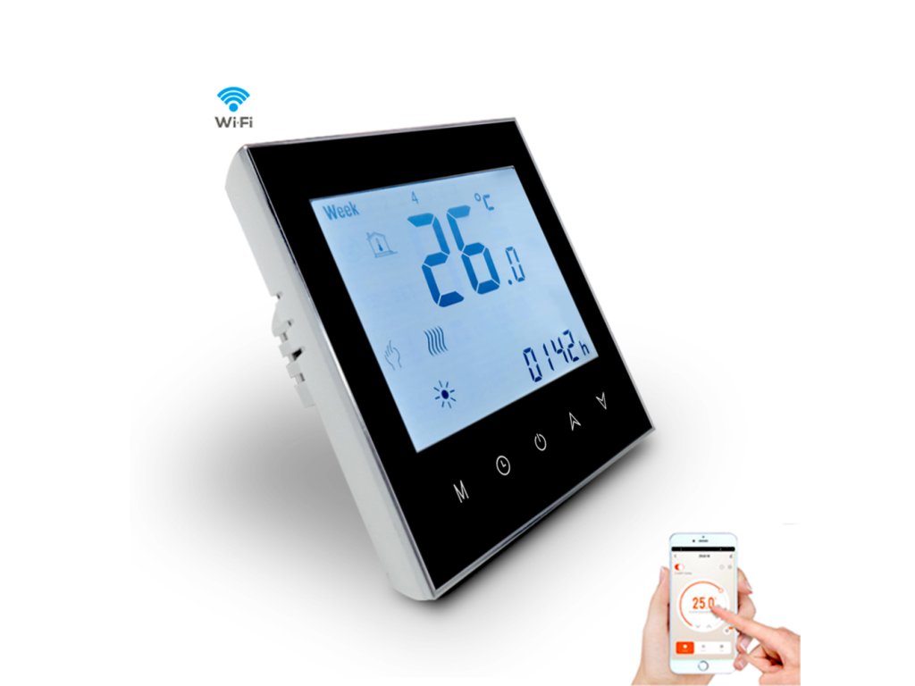 Dotykový pokojový LCD termostat je programovatelný, obsahuje teplotní čidlo, ovládání možné i přes WIFI aplikaci, určenou pro el.kotel EBO a EBO DUO.