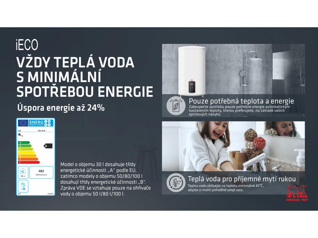 Elektrický tlakový ohřívač vody ELÍZ UNI 30 W je vyhotoven v plochém provedení s konceptem dvou nádrží. Každá nádrž je vybavena samostatným topným tělesem. Je určen pro svislou nebo vodorovnou montáž a je vhodný pro jedno nebo více odběrných míst. Hloubka ohřívače je pouhých 245 mm.
