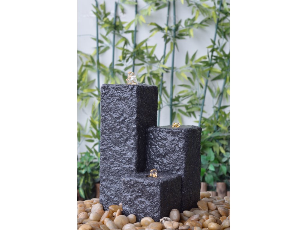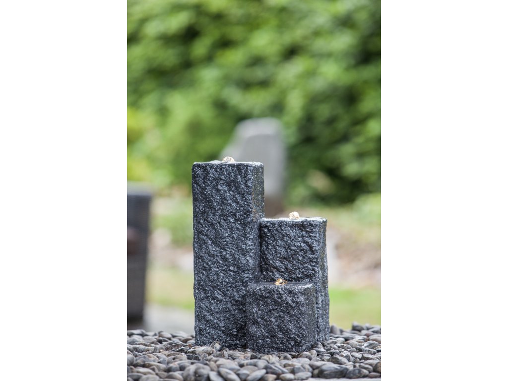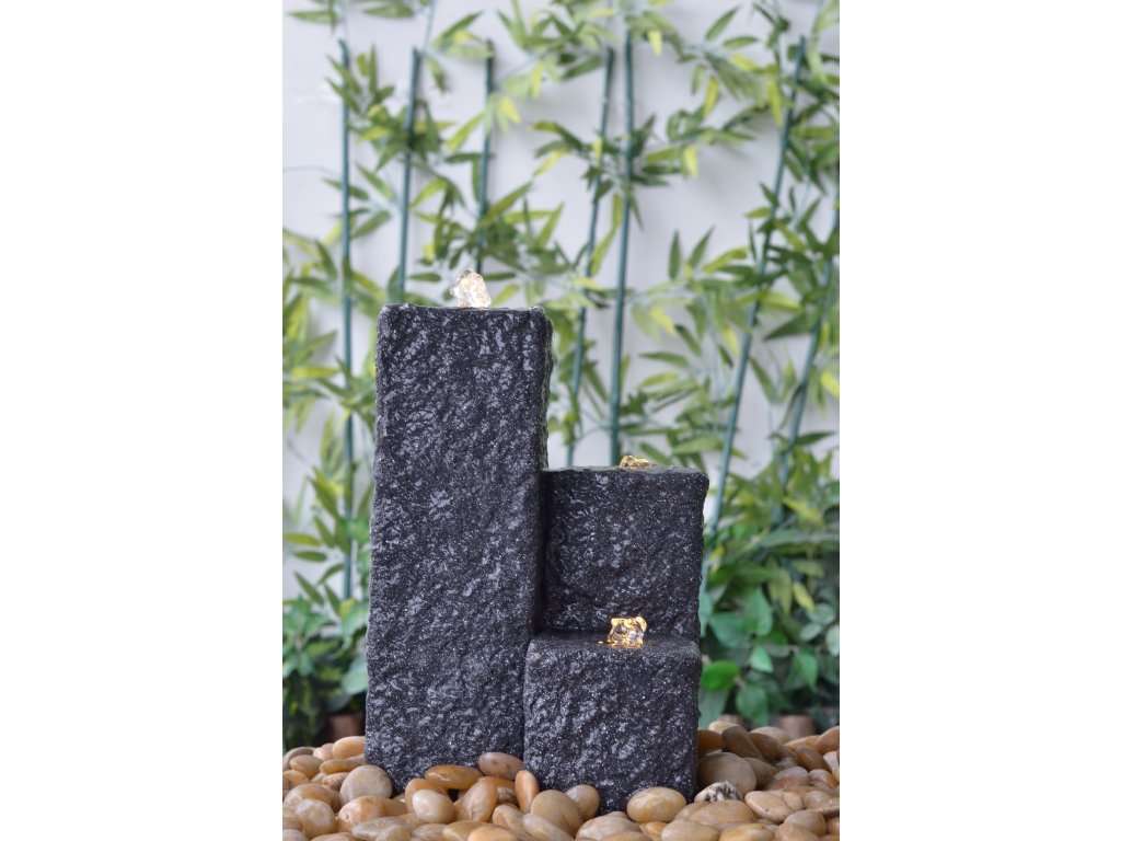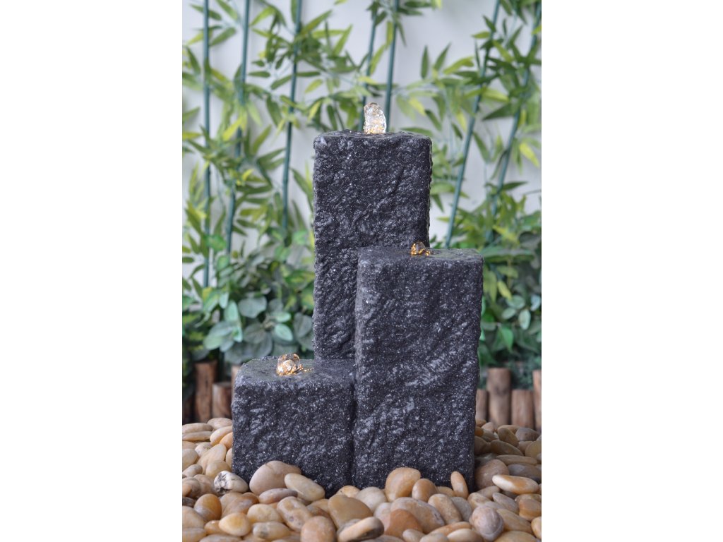Fontána Heissner NEPTUN LED, antrazit Designová zahradní fontána Heissner je vkusným doplňkem do každé zahrady. Uklidňující zvuk vody a nasvícení vody pomocí LED osvětlení vytvoří vždy příjemnou relaxační atmosféru. Fontána je vyrobena z materiálu Polystone, který se často označuje jako umělý kámen. Na první pohled je od kamene neroznatelný, vyniká v dlouhé životnosti, ale je lehčí než přírodní kámen. Fontána je dodávána jako kompletní set. Kromě těla fontány a podzemní sběrné nádržky na vodu je součástí balení čerpadlo s 5 m dlouhým kabelem a LED osvětlení. Fontána funguje jako uzavřený okruh, kdy se do sběrné nádržky naleje voda, která pomocí čerpadla vyvěrá z fontány a poté přes fontánu stéká zpět do sběrné nádržky.Parametry:Materiál PolystoneBarva antracitLED osvětlení ano, 3xRozměr věží v cm 12 x 12Výška věží v cm 15 / 25 / 40Výkon čerpadla 800 l/hPříkon čerpadla 17 WObjem sběrného koše 45 lDélka kabelu 5 mDoplňkové parametry