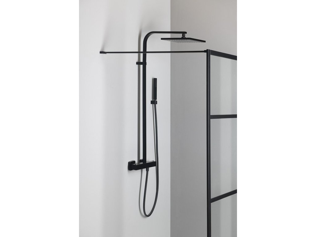 | Stabilitu zajišťuje kolmá vzpěra o délce 1000 mm. Její délku lze upravit na požadovaný rozměr. | Zevnitř je sklo dokonale hladké. Navíc je ošetřené vrstvou Coated Glass pro snadnou údržbu. | Industriální design je zdůrazněn hliníkovými profily v barvě černá mat, které lemují sklo. |