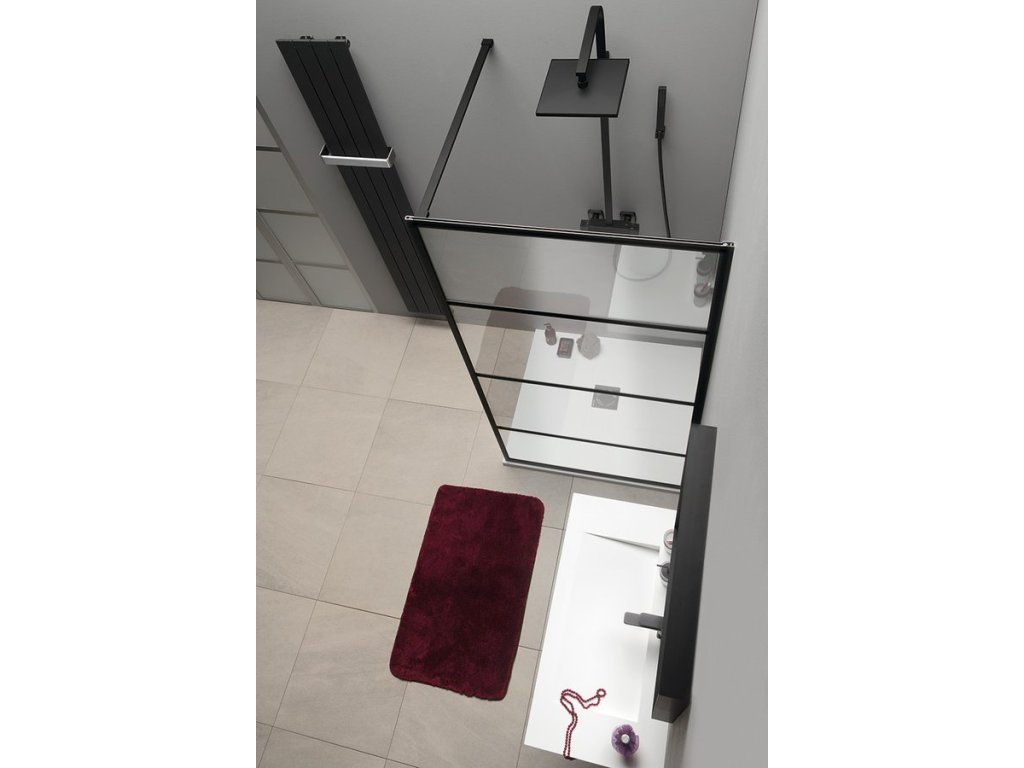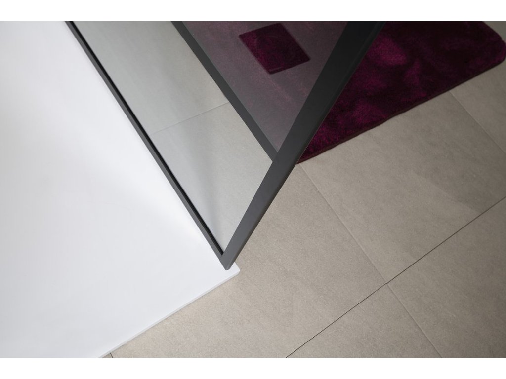 Stabilitu zajišťuje kolmá vzpěra o délce 1000 mm. Její délku lze upravit na požadovaný rozměr. Zevnitř je sklo dokonale hladké. Navíc je ošetřené vrstvou Coated Glass pro snadnou údržbu.     Industriální design je zdůrazněn hliníkovými profily v barvě černá mat, které lemují sklo.