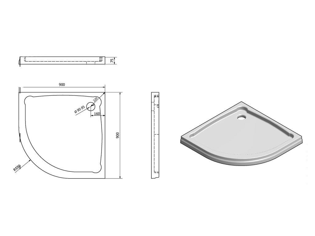 Gelco HERA sprchová vanička z litého mramoru, čtvrtkruh, 90x90x7,5cm, R550, bílá GH559