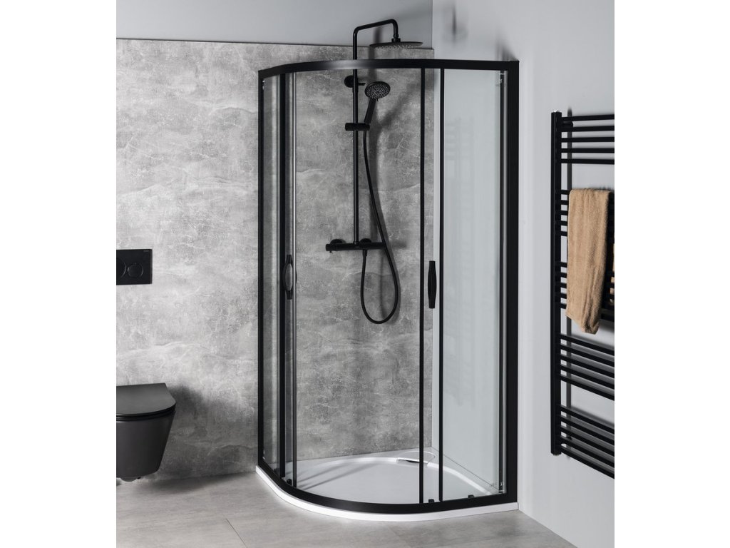 - Čtvrtkruhové zástěny a čtvrtkruhové zástěny s prodlouženou stěnou s posuvnými dveřmi