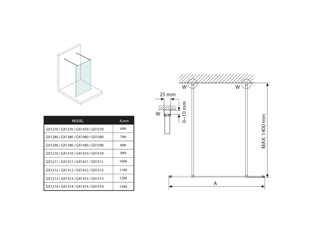 - Zástěny v šířkách 700 až 1400 mm