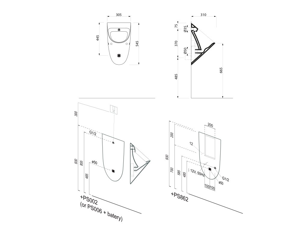 - Při instalaci s automatickým splachovačem PS002 je nutné instalovat i napájecí zdroj (PS05T nebo PS10T).