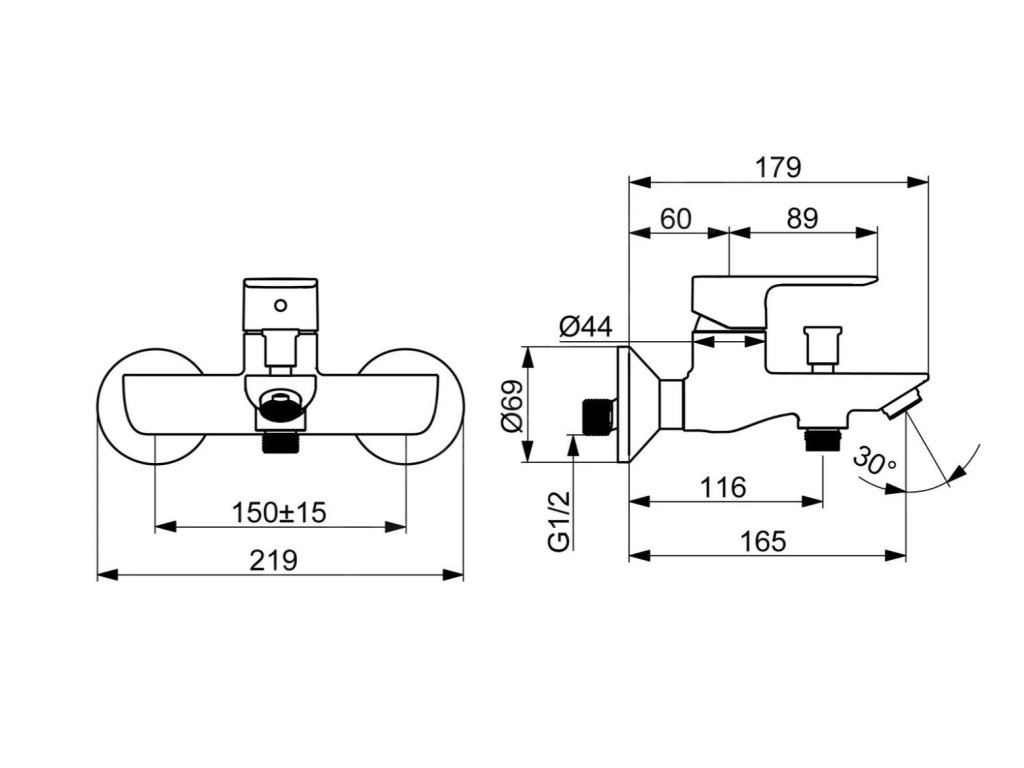 Páková nástěnná vanová baterie bez sprchového setu v chromovém provedení. Rozteč baterie 150 mm. V barevném provedení lesk.