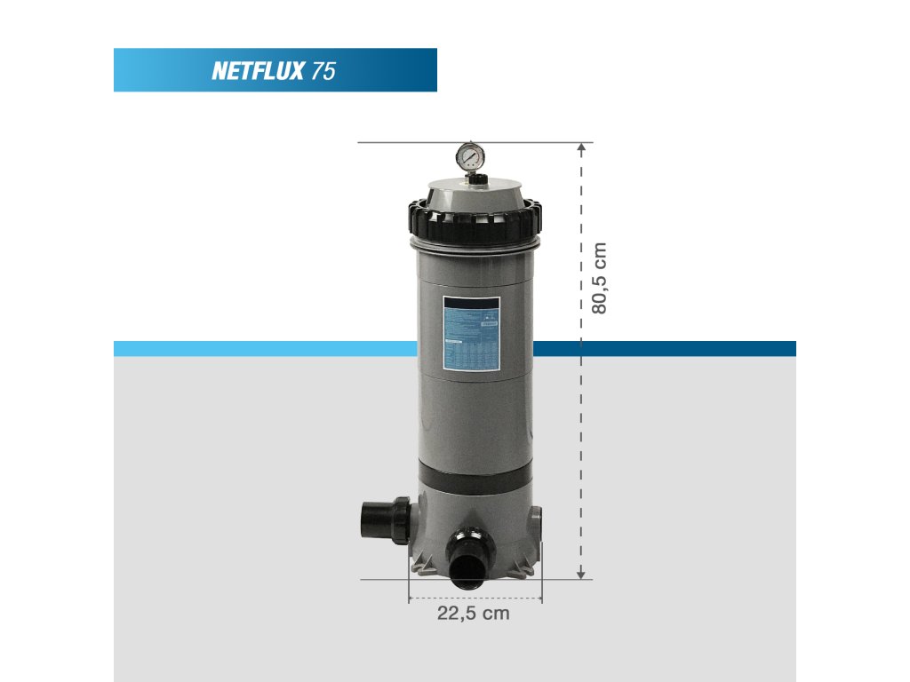 Filtr Netflux je také vybaven vysoce kvalitním tlakoměrem, který poskytuje jasný přehled o provozním tlaku. Tato funkce umožňuje snadné sledování stavu filtru a rychlý zásah v případě potřeby, čímž je zajištěna optimální filtrace vody ve vašem bazénu nebo vířivce.