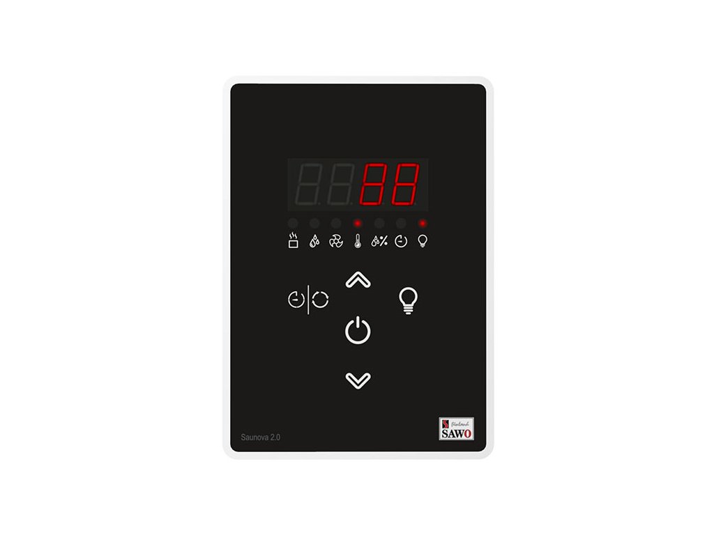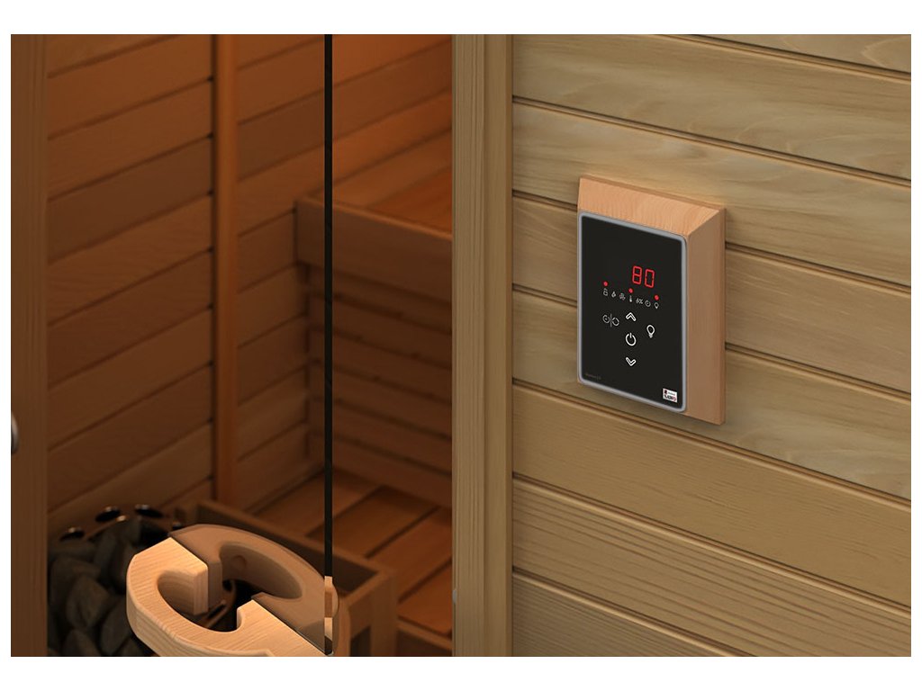 Kontrolní jednotka Saunova 2.0 pro malá saunová kamna do 9 kW. Ovládání lze umístit přímo v sauně nebo i zvenčí. Jedná se o inteligentní systém, který je schopný vypnout topné těleso po dosažení požadované teploty. Zároveň udržuje topné těleso v rovnováze a tím snižuje kolísání teploty.