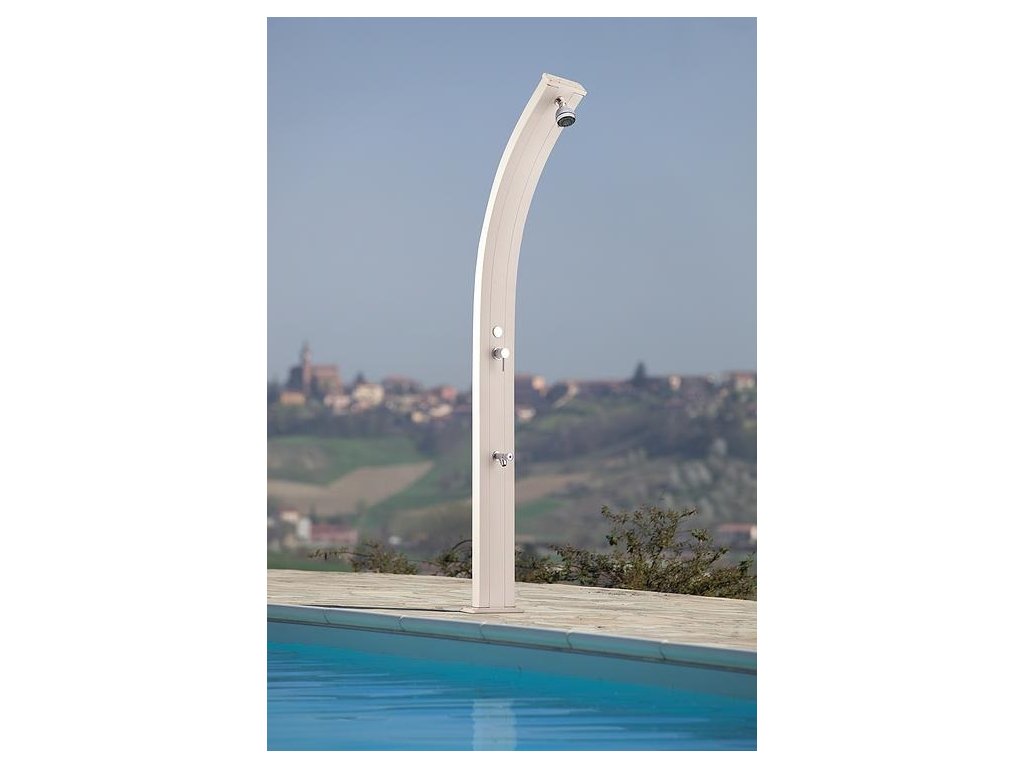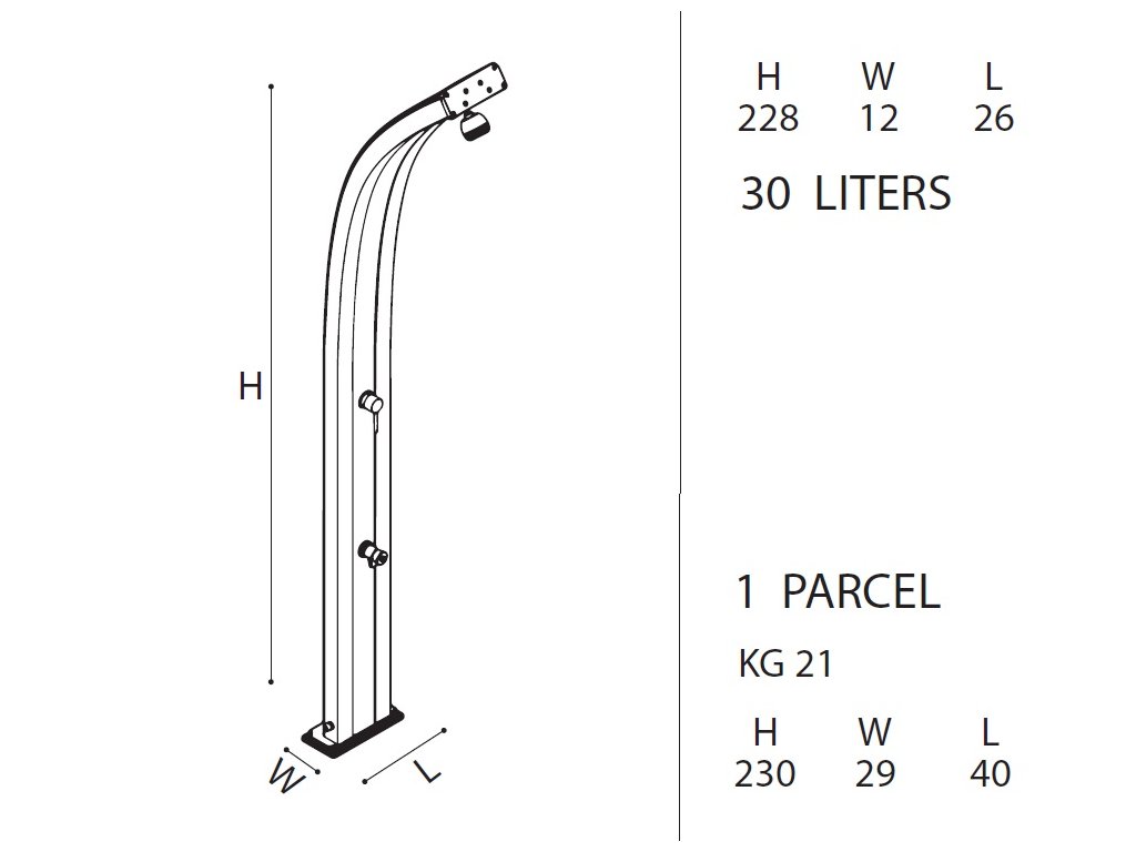 Solární sprchy Solární sprcha Formidra SPRING 30L, antracitová Solární sprcha s oplachem nohou Formidra SPRING 30L, černá/inox Výrobce: Formidra (Itálie) Solární sprcha italského výrobce Formidra SPRING s oplachem nohou v zahnutém provedení a jedinečným designem inspirovaným modelem DADA. Je také vyrobena z hliníku, jen v menším 30 litrovém provedení. Samonosná konstrukce sprchy je navržena jednak jako zásobník na vodu a zároveň jako solární kolektor, který využívá k ohřevu vody energii ze slunce. Montáž je velice jednoduchá a může být prováděna koncovým uživatelem. Solární sprchu jednodušše připevníte k podlaze vruty s hmoždinkami, které jsou součástí balení a pak jen připojíte zahradní hadici. Doporučujeme umístit sprchu na místo, kam slunce přes den svítí nejvíce, abyste zkrátili dobu potřebnou k ohřevu vody na minimum. Elegantní a moderní vzhled solární sprchy SPRING ozdobí Vaši zahradu a stane se samostatným prvkem pro osvěžení a relaxaci. - mixér horké a studené vody - hliníkové tělo - sprchová hlavice v chromovém provedení - kohoutek sloužící k opláchnutí nohou (ovládání a kohoutek - obojí v chromovém provedení) - napojení hadice pomocí bočního ventilu - kapacita 30 l vody - výška 224 cm - šířka 26 cm - hloubka 12 cm - celková hmotnost 15 kg Barevné provedení: černá Navštivte náš značkový SVĚT VÍŘIVEK & ELEKTROKOL v Praze - Čestlicích (Čestlice 272/289; D1 Exit 8 směr Dobřejovice). Solární sprchy FormidraDoplňkové parametry