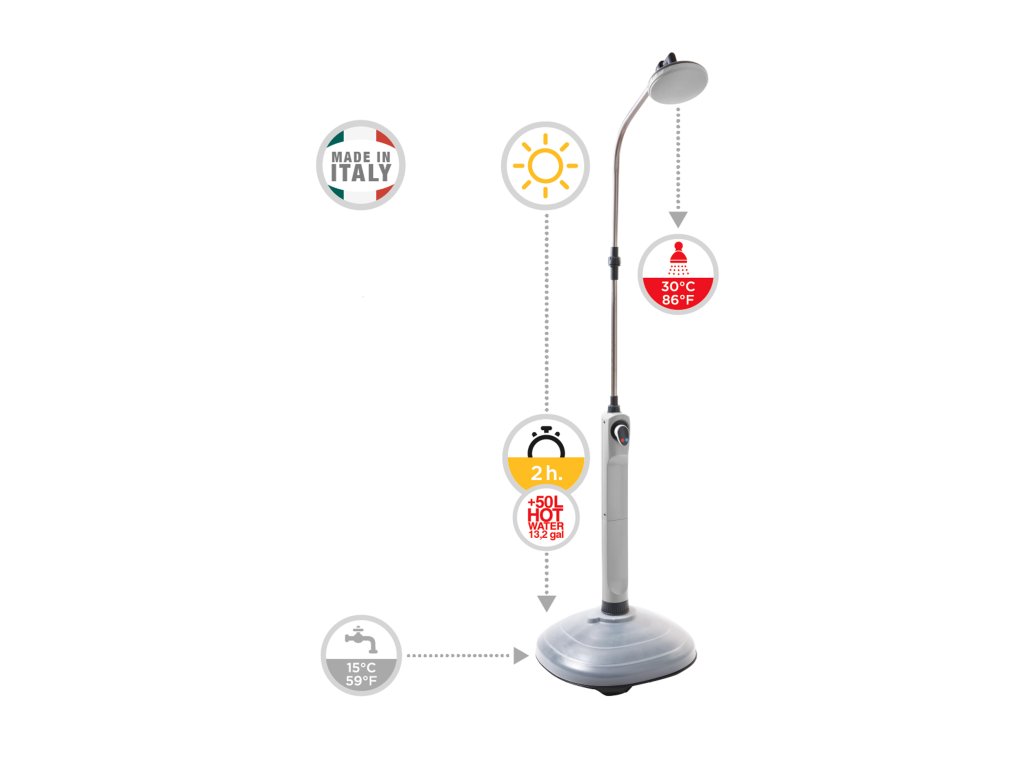 Solární sprcha Sunny NIAGARA využívá přirozené sluneční světlo k přirozené a bezplatné výrobě teplé vody. Při vystavení slunci po dobu asi dvou hodin může jednotka díky ohřevu vody v základně nádrže poskytnout několik horkých sprch o požadované teplotě díky vestavěnému ovládání směšovače.