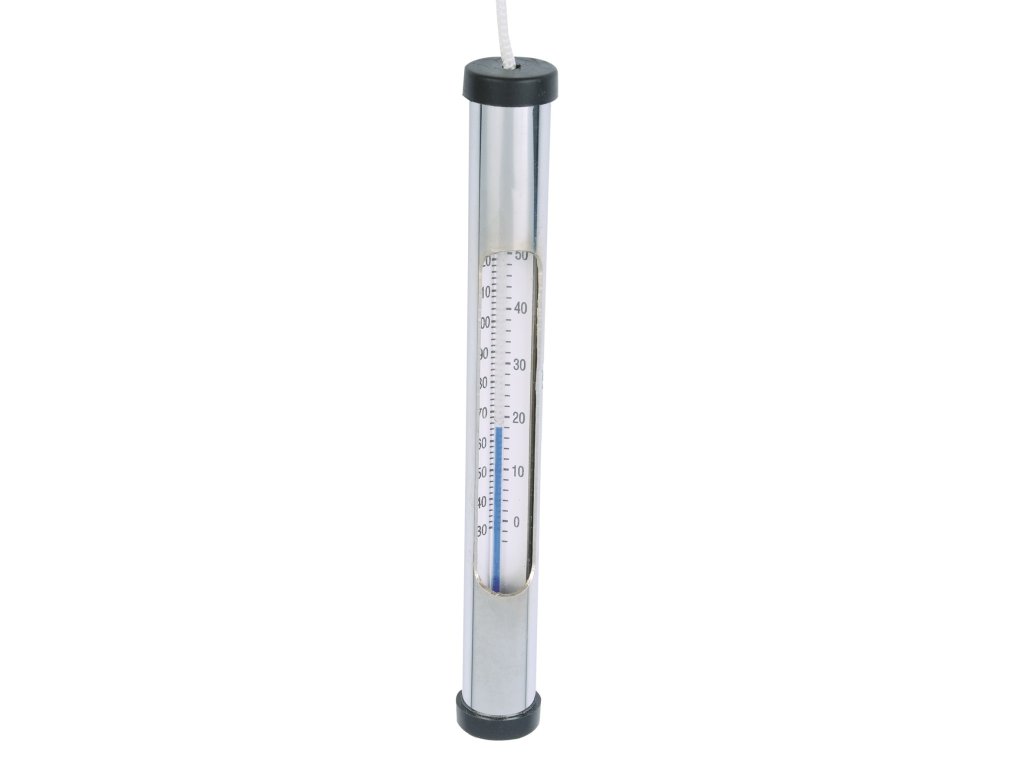 Neplovoucí chromovaný teploměr se šňůrkou pro uchycení k bazénu.