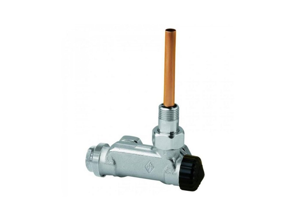 Ventil pro jednobodové připojení otopných těles do dvoutrubkových otopných soustav, v rohovém provedení. Poniklovaný bronz.