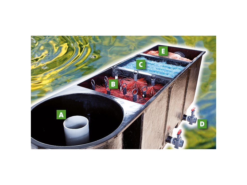 Jezírkový filtrační systém Heissner pro čistou a jasnou vodu ve vašem jezírku. Firma Heissner má více jak 100 let zkušeností s filtračními systémy od tlakových po průtokové a podvodní filtrace. Filtrační systém jednoduše zvolíte dle objemu Vašeho jezírka. Profi průtoková filtrace Heissner F322-00, používá léty osvědčenou konstrukci, velká odstředivka odloučí hrubé i jemné nečistoty. Pak voda pokračuje do dalších komor, které jsou vyspádované a pro snadné čištění má každá svůj vlastní odkalovací ventil. Profi venkovní filtr Apollo může být umístěn vedle jezírka. Je dodáván se všemi filtračními médii a přípojkami. Nejdříve se voda filtruje v první komoře přes odstředivku Vortex, kde se zbaví všech hrubších nečistot před vstupem do biologické části jezírkové filtrace. Nátok vody z jezírka je uprostřed výšky odstředivky a je zaústěn excentricky tak, aby docházelo k rotaci vody. Přepad z odstředivky je v horní části, tak je zaručeno, že nečistoty rotují ve vodě a klesají, dokud se neusadí na dně. Dál voda pokračuje do komory se Sansai kartáči kde dojde k zachycení drobných nečistot. Kartáče jsou vybaveny očky pro snadné vyjmutí. V další části je umístěna filtrační japonská rohož, která slouží jako biologická filtrační plocha pro osídlení filtračních bakterií. V další komoře je speciální filtrační substrát, který se preventivně stará o čistou vodu v zahradním jezírku a podporuje dlouhodobé přirozené čištění vody. Váže škodliviny a přebytečné živiny a bakteriálně je odbourává. K filtraci je dodávány dva přípravky na úpravu vody. Odstraňovač fosfátu 1000 ml, odebere z vody živiny pro řasy. Startovací bakterie k urychlení vzniku biologického samočištění vody .Každá komora filtru je vybavena výpustí pro snadné odkalení.Odkalovací ventily je možné prodloužit za pomocí trubek DN 50 a výpusť do jezírka pomocí DN 125. Tím můžete filtraci umístit dále od jezírka.ParametryPro jezírka bez ryb do objemu 80 m³Pro jezírka s rybami do objemu 40 m³Pro jezírka s koi kapry 20 m³Doporučené čerpadlo HFP7000-00 7 000 l/h / 65 WDoporučená UV lampa F455X-00 55 WFiltrační média Sansai kartáče, japonská filtrační rohož, filtrační substrátOdstraňovač fosfátu 1000 gStartovací bakterie do jezírka 1000 mld x š x v 176 x 46 X 67 cmDoplňkové parametry