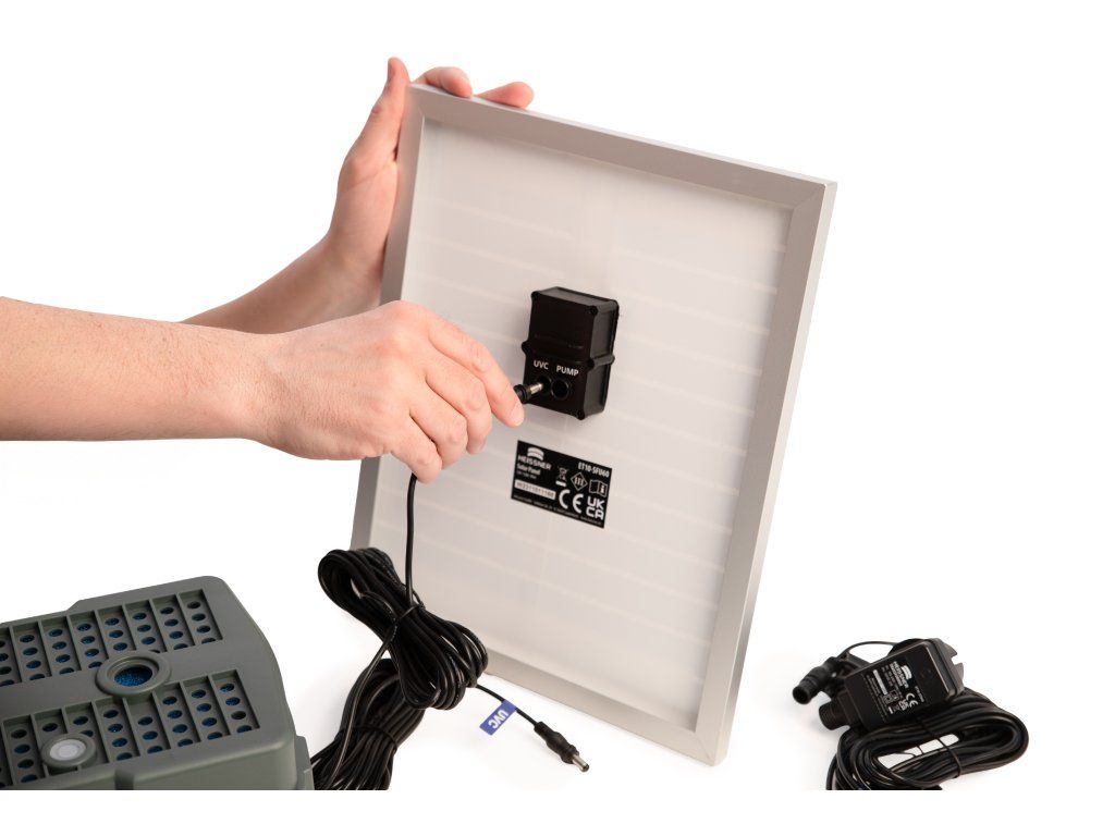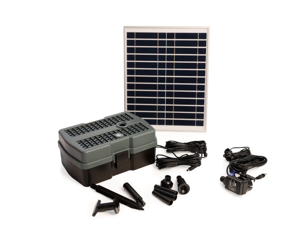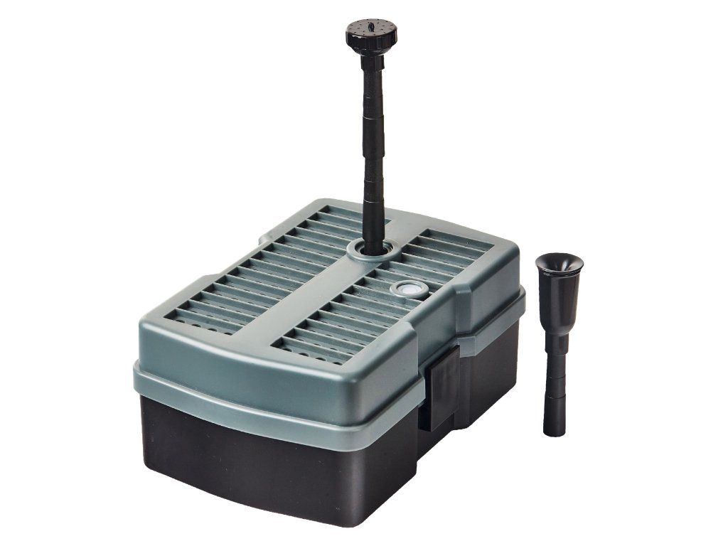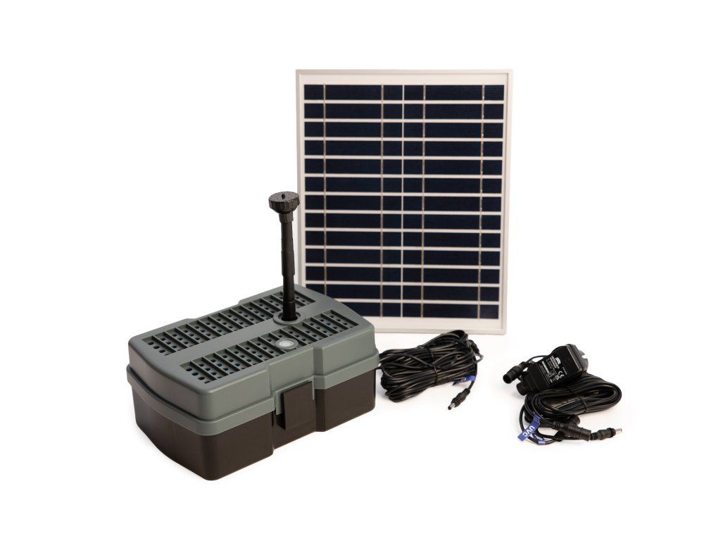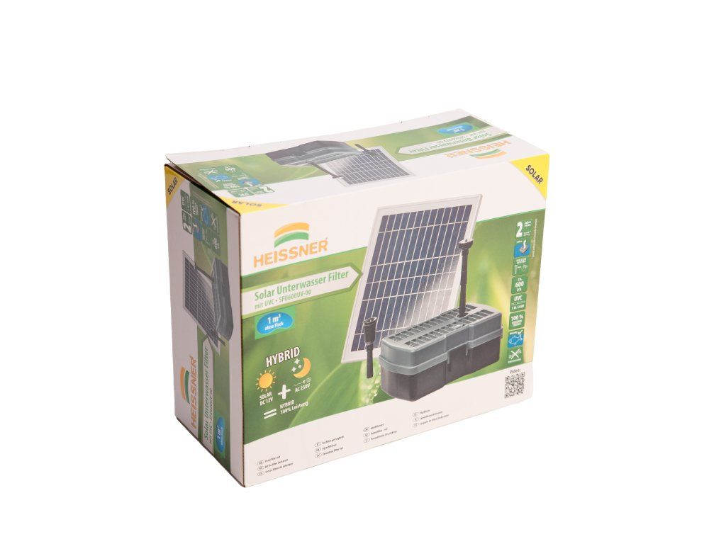 Jezírkový filtrační systém Heissner pro čistou a jasnou vodu ve vašem jezírku. Firma Heissner má více jak 100 let zkušeností sfiltračními systémy od tlakových po průtokové a podvodní filtrace. Vhodně poskládané plně vybavené sady obsahují vše potřebné pro udržení čistého jezírka. Filtrační systém jednoduše zvolíte dle objemu Vašeho jezírka. Podvodní filtrace vše v jednom Je určeno pro jezírka do 1000 l. Podvodní filtrace s čerpadlem a integrovanou UV lampou 5 W pro ti řasám. Na těle filtrace je průzor pro kontrolu UV lampy. Celoplošný filtrační povrch s mechanickou filtrací zaručuje prodloužení intervalu mezi nutnou údržbou. Žádná část filtrace prakticky není vidětdíky umístění na dně jezírka. Sada čerpadla s filtrem obsahuje teleskopickou trubici a dvě trysky pro vodni efekty. Je osazena filtračními médii, filtračním molitanem pro hrubé nečistoty, bio domečky pro usídlování filtračních bakterií pro biologickou filtraci. Díky solárnímu panelu máte za slunných dní provoz zcela zdarma, ale je i možnost díky dodávanému trafu zapojit filtraci i do elektrické sítě. Parametry: UV lampa: 5 WSolární panel: 12 Wvýkon: 600 l/hvčetně 2 vodních efektůd × š × v: 41 × 37 × 40 cmDoplňkové parametry