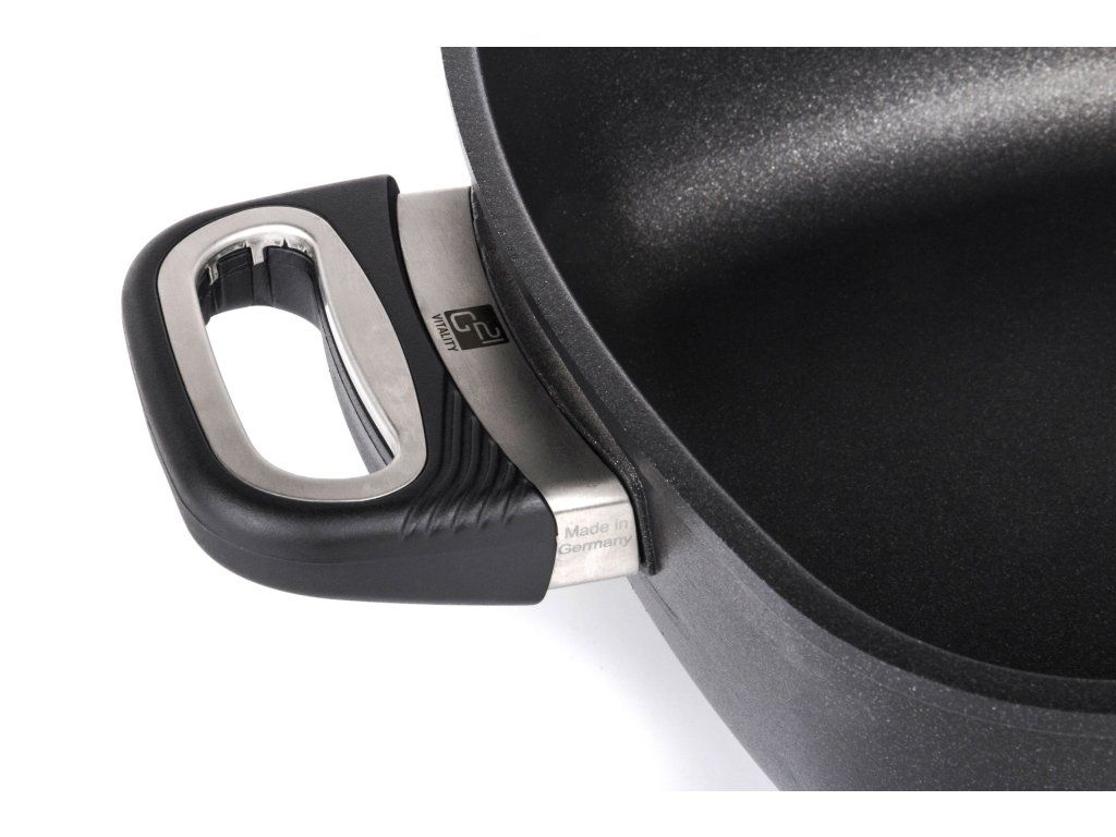 - Pánev je vhodná na všechny typy sporáků – na indukci, plyn i varnou desku nebo pro použití v troubě (po odejmutí rukojeti)
