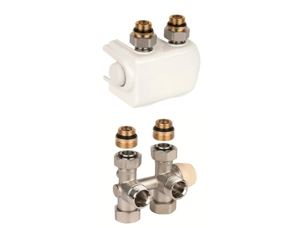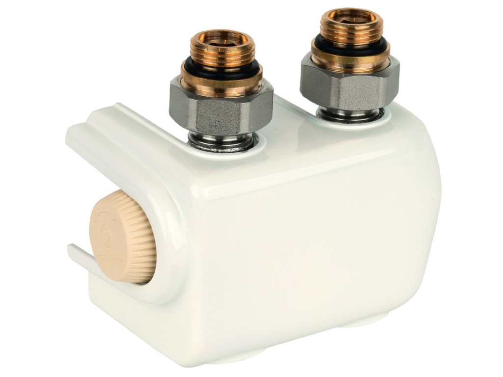 Regulační a uzavírací šroubení Therafix (H-blok) přímé/rohové (univerzál pro vývody z podlahy/ze zdi) s vestavěným termostatickým ventilem (kuželka VS), připojení potrubí 3/4", připojení otopného tělesa : integrovaný eurokonus, dekorační kryt bílý